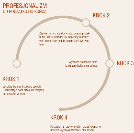 Przygotujemy szkice projektów – jako nasze propozycje, zaprezentujemy zdjęcia wykonanych przez nas prac, by w konsultacji z Państwem stworzyć nową dekorację. W tym procesie doradzamy przy wyborze tkanin – dobieramy kolorystykę, fakturę, dodatki. Kierujemy się przy ich doborze charakterem wnętrza (stylem), jego stopniem naświetlenia, wygodą w użytkowaniu okien, łatwością w czyszczeniu i konserwacji proponowanych dekoracji.